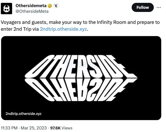 今年 3 月 26 日,Yuga Labs 宣布上线「Otherside: 2 nd Trip」活动,Voyagers 和受邀访客需前往 Infinity Room 并准备进入 2 nd Trip。在此前对活动的介绍中,Yuga Lasb 称此次更新将引入全新游戏环节和新的机制,并提供更多游戏化选项和高能娱乐性,BAYC、MAYC 和 Meebits 持有者均可以在游戏里中直接使用 NFT 化身。