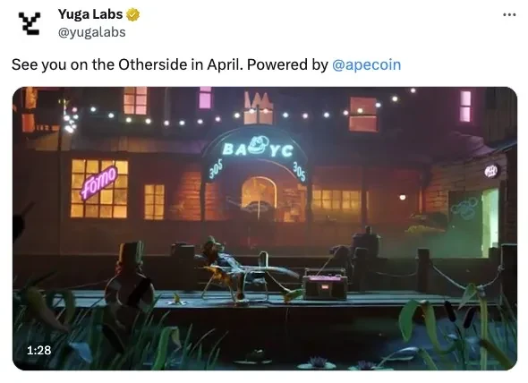 Otherside 是 Yuga Labs 旗下的元宇宙项目,承载了 Yuga Lasb 在 NFT 领域的宏大构想。2022 年 3 月,Yuga Labs 在社交媒体上 公布 其新项目「Otherside」的宣传视频,视频内出镜的 NFT 系列包括 Bored Ape Yacht Club 、 CryptoPunks 等著名品牌。