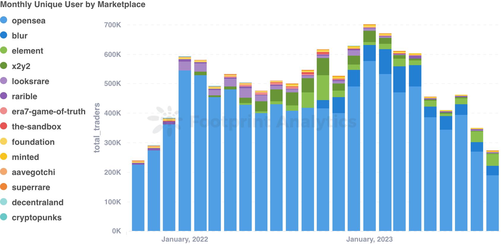 9 月份,NFT 市场的整体用户活跃度有所下降,导致参与大多数交易市场的用户数量减少。尽管出现了这种趋势,OpenSea 仍然占据主导地位,吸引了 18.96 万 独立用户的庞大用户群。不过,这一数字与 8 月份相比大幅下降了 29.7% 。 另一方面, Element 的用户参与度呈现积极趋势。9 月份,它的独立用户数量为 4.13 万,与上月相比增长了 13.7% 。