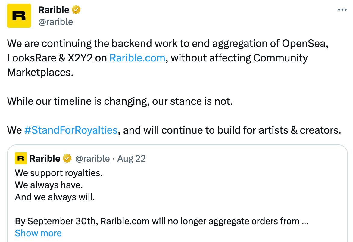 整个 9 月份,NFT 交易市场继续围绕 NFT 版税展开激烈讨论。 Rarible 宣布决定在 9 月 30 日之后停止聚合来自 OpenSea、LooksRare 和 X2Y2 的订单。这一举措展示了 Rarible 对版税的支持态度。