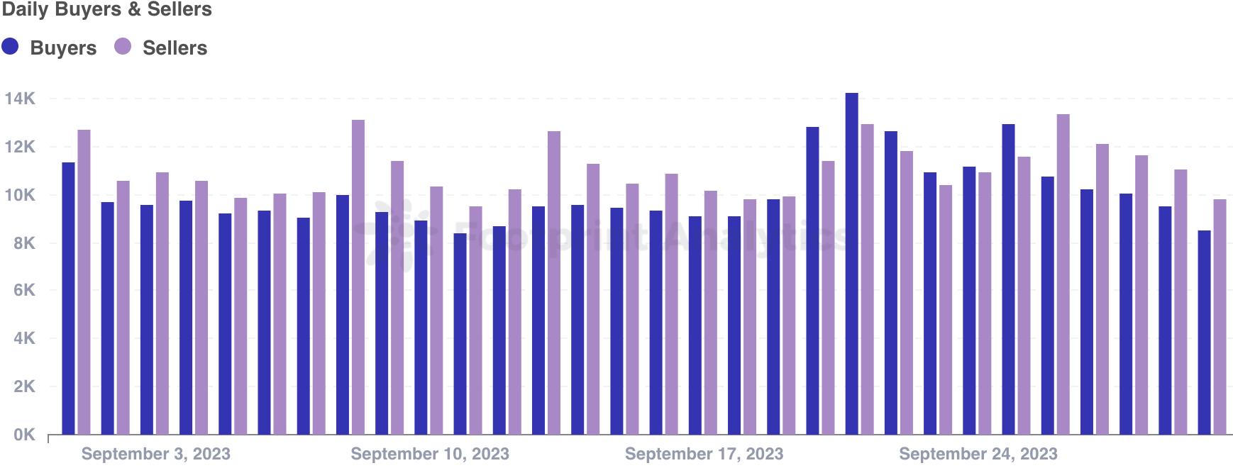 9 月份,NFT 市场的买方/卖方比率为 103.0% ,较 8 月份下降了 29.2% 。全月共有 14, 832 名买家和 143, 617 名卖家。值得注意的是,与上月相比,买家人数减少了 30.6% ,卖家人数减少了 11.0% 。这些数据表明, 9 月份 NFT 市场活动放缓,参与的买家和卖家数量减少,市场熊市情绪仍占上风。
