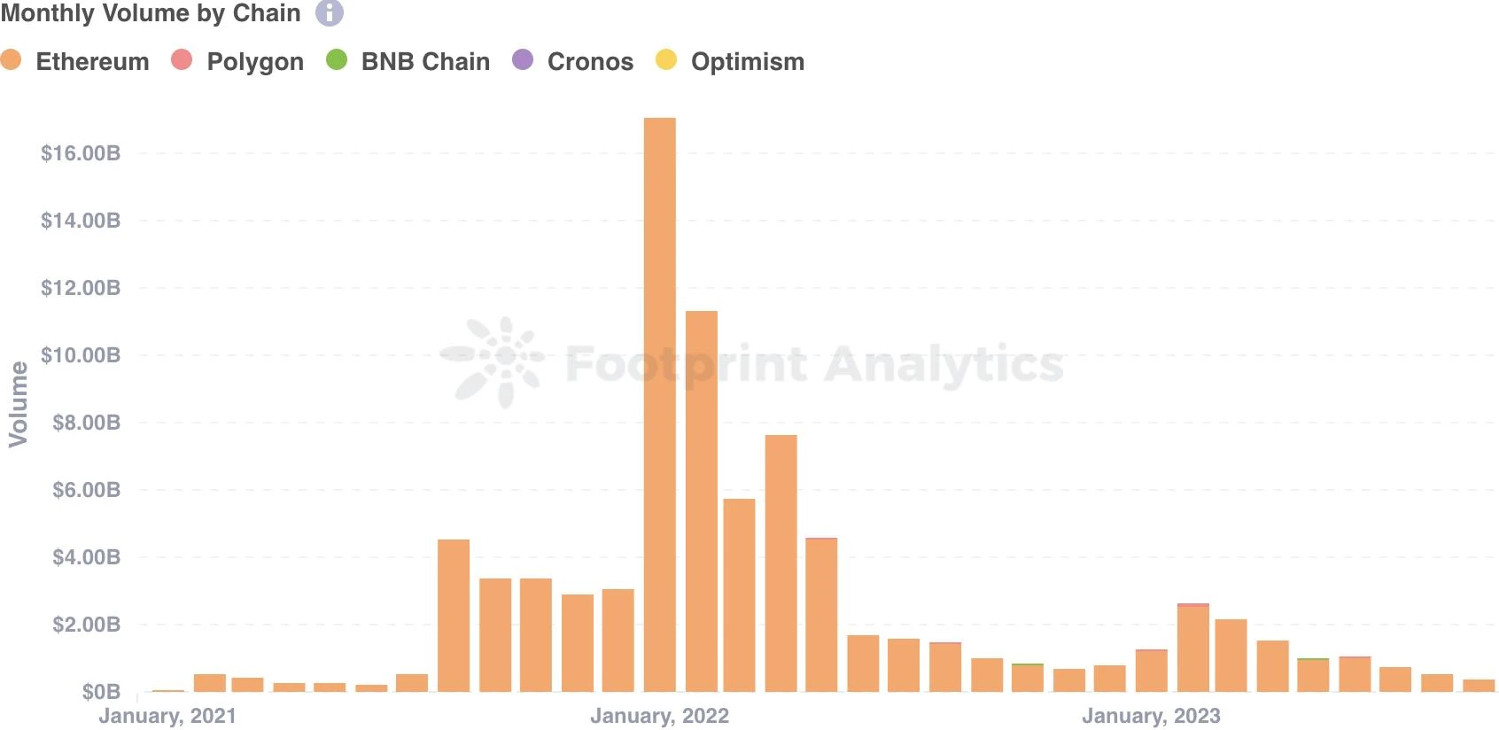 9 月份,以太坊的交易量达到了 3.64 亿美元,占据了 NFT 市场总交易量的 98.1% 。然而,与 8 月相比,以太坊的总交易量下降了 30.3% ,反映出整个 NFT 市场的下行趋势。