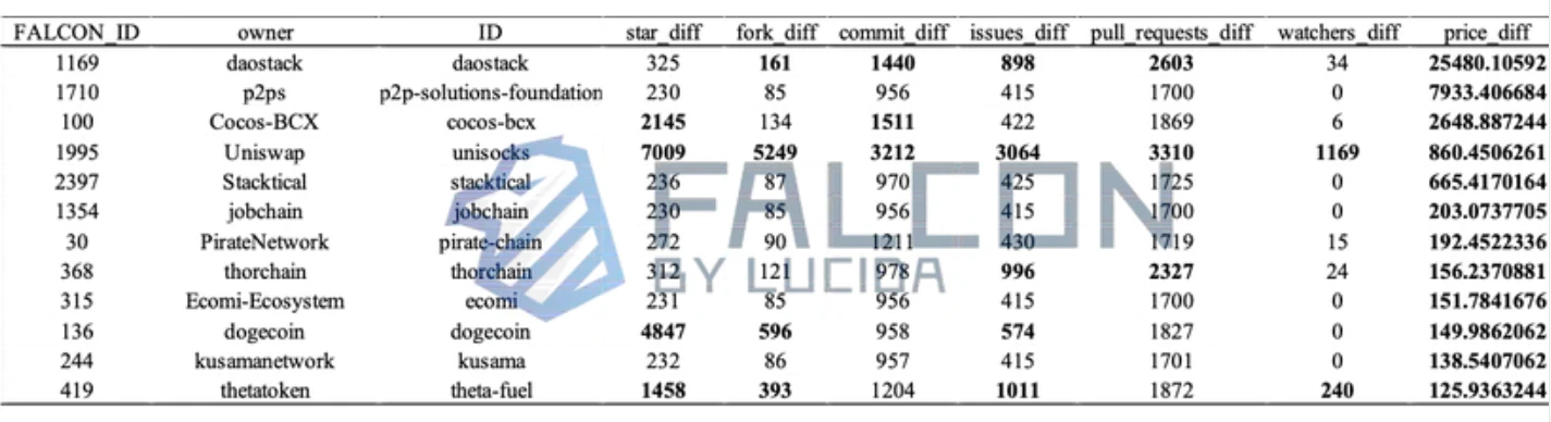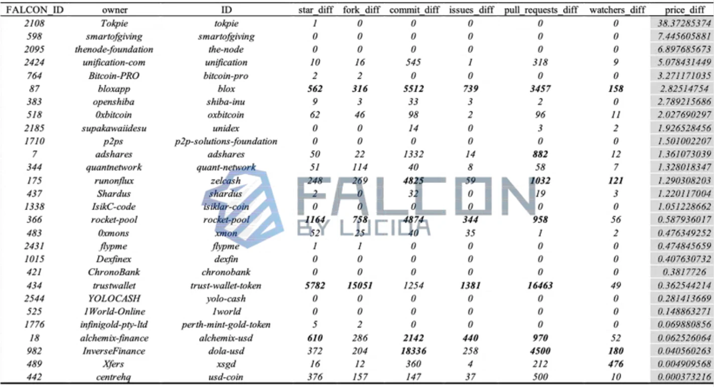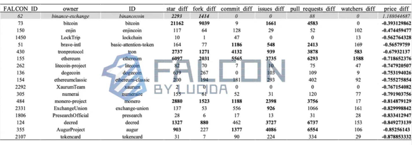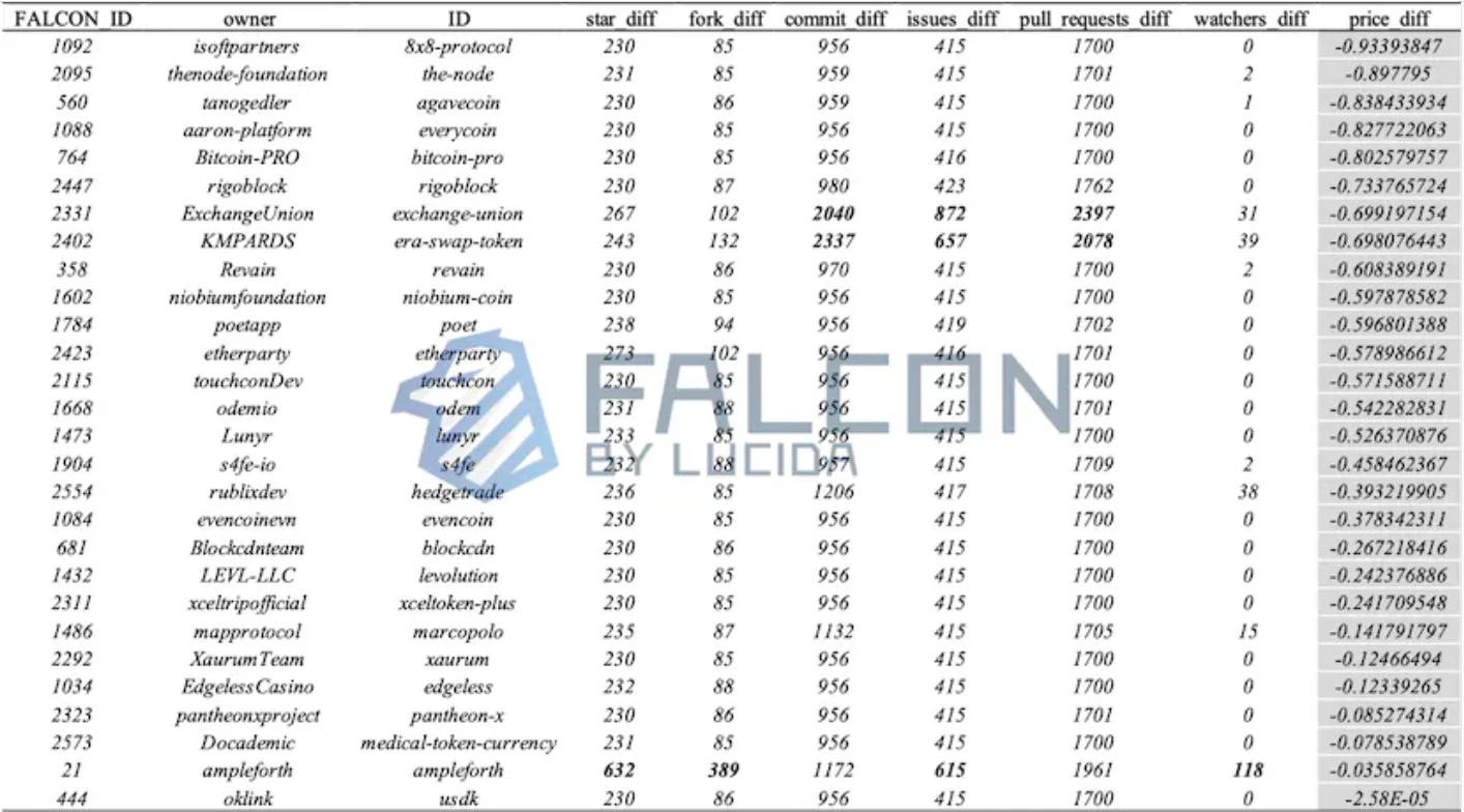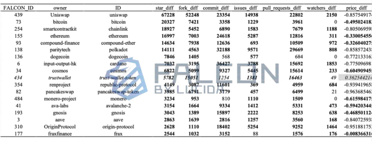 该区间币价涨幅超过平均涨幅值(黑色加粗)的币价及其对应的 GitHub 数据六因子的统计情况: