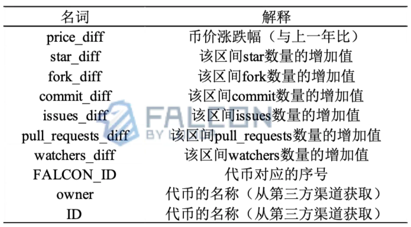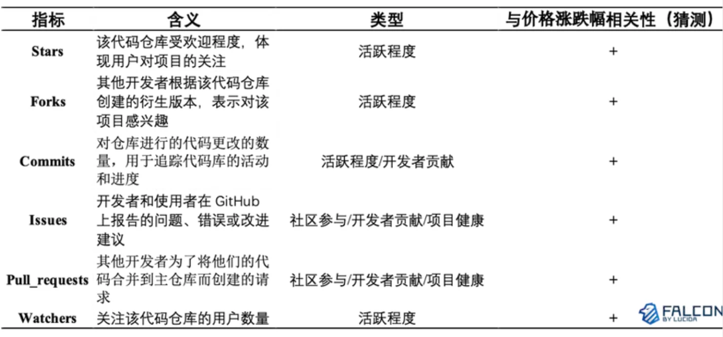 因此,**Falcon 将 GitHub 的 6 个因子作为衡量“团队在做事”的量化标准,具体包括:Star、Fork、Commit、Issues、Pull requests、Watchers。**以下为六个因子的具体含义和类型