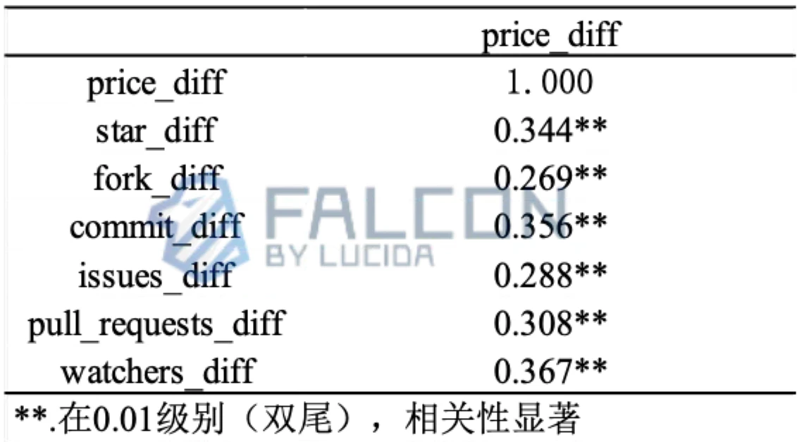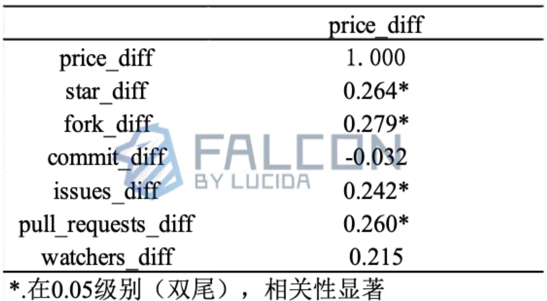 GitHub 数据的 5 个因子对于币价在熊市的抗跌有正向作用。 由表易得,star、fork、issues、pull_requests、watchers 与 price 的相关性系数值都在 0.260 左右,并都呈现出 0.05 水平的显著性,统计学意义上表明 5 因子与币价都具有正相关性。