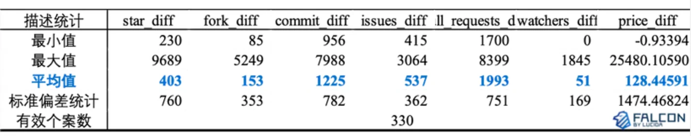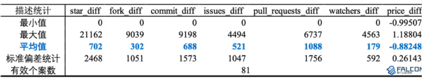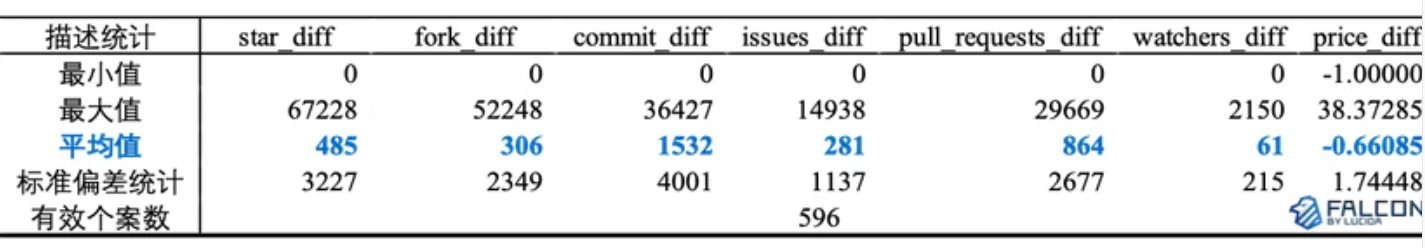 GitHub 数据六因子及币价涨跌幅的描述统计: