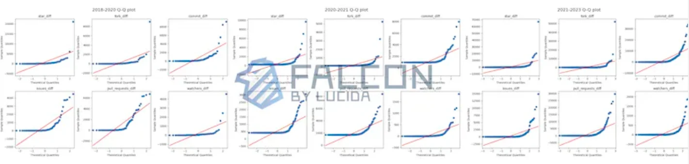 由表所知,三个区间 Star、Fork、Commit、Issues、Pull_requests、Watchers 六个因子的样本点都不围绕第一区间的对角线分布,即都不服从正态分布。 六因子与代币价格的相关性分析将基于 Spearman 系数的结果进行判断。
