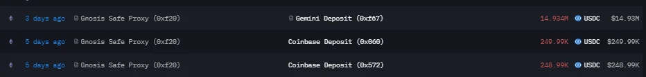 随后,USDC 被分别转入到了 Coinbase 和 Gemini 两个加密货币交易所中的三个地址上,如下图: