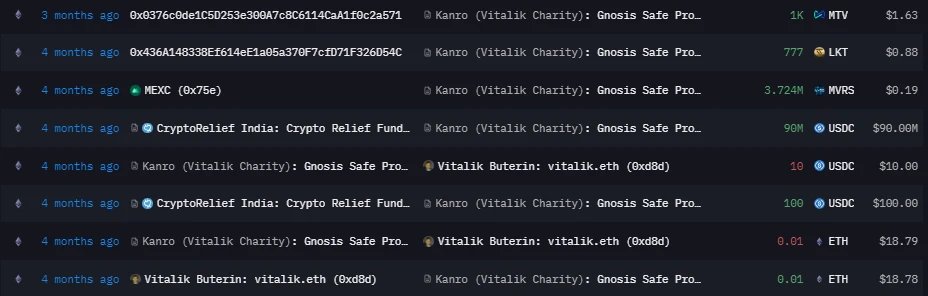 链上数据分析平台 Arkham 追踪数据显示,大约四个月前的确有价值 1 亿美元的加密货币被转入到 Kanro 地址(这与 Vitalik Buterin 承诺提供 1 亿美元捐赠的时间吻合),如下图所示,其中包括: