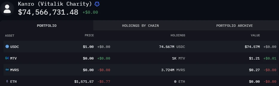 目前 Kanro(Vitalik Charity)实体下剩下的加密资产总价值大约接近 7500 万美元,其中包括约 7456.7 万枚 USDC、 1000 枚 MTV、 372.4 万枚 MVRS,但该慈善实体内持有的 ETH 数量显示为零,如下图: