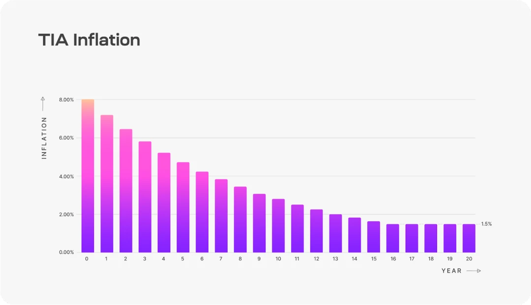 这里的 8% 可以理解为若创世区块发行的 10 亿枚全部从一开始就参与质押,那么年利率将会是 8% ,也就是一年将产出 8 百万颗 TIA(固定的),第二年变为 8 百万减去 80 万(10% ), 720 万颗。