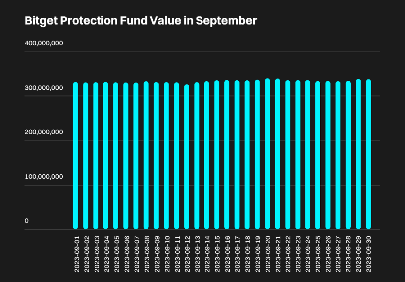 10 月 11 日,Bitget 公布 9 月份保护基金最新数据,数据显示 9 月保护基金最高规模为 3.409 亿美元(9 月 20 日) ,最低规模为 3.317 亿美元(9 月 2 日),平均规模为 3.347 亿美元, 9 月份保护基金规模持续保持在 3.3 亿美元以上。