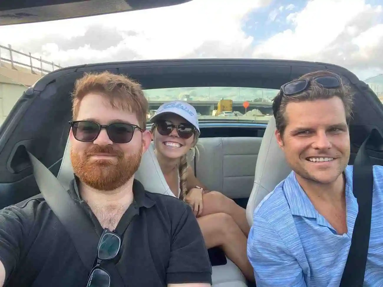 2021 年,Charles Johnson(左)与众议员 Matt Gaetz(右)和 Gaetz 的现任妻子 Ginger Gaetz(中)。Johnson 告诉 Insider,他促成了 Thiel 与将成为他处理人的 FBI 特工之间的接触。图源:Charles Johnson