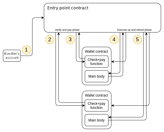 为解决以上种种问题,ERC-4337 提案通过引入称为“UserOperation”的交易对象来实现账户抽象,用户可以使用同时具备智能合约和 EOA 功能的单一钱包账户(账户抽象钱包)。不同的用户将 UserOperation 对象发送到 UserOperation 内存池中。由 Bundler 打包交易并提交到以太坊内存池。被打包的交易会经由 Entry Point 合约进行验证,然后调用特定的 Wallet 合约执行具体操作,随后上链。流程如下图所示: