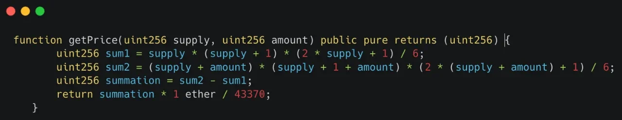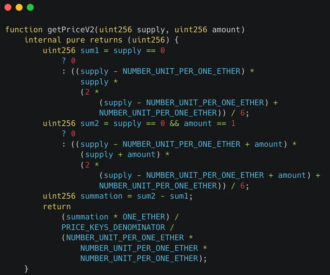 New Bitcoin City 也同样采用了与 Friend.tech 类似的定价模型,代码中的 PRICE_KEYS_DENOMINATOR 为 264000 ,NUMBER_UNIT_PER_ONE_ETHER 为 10 。相比 TOMO,价格增加得更加缓慢。