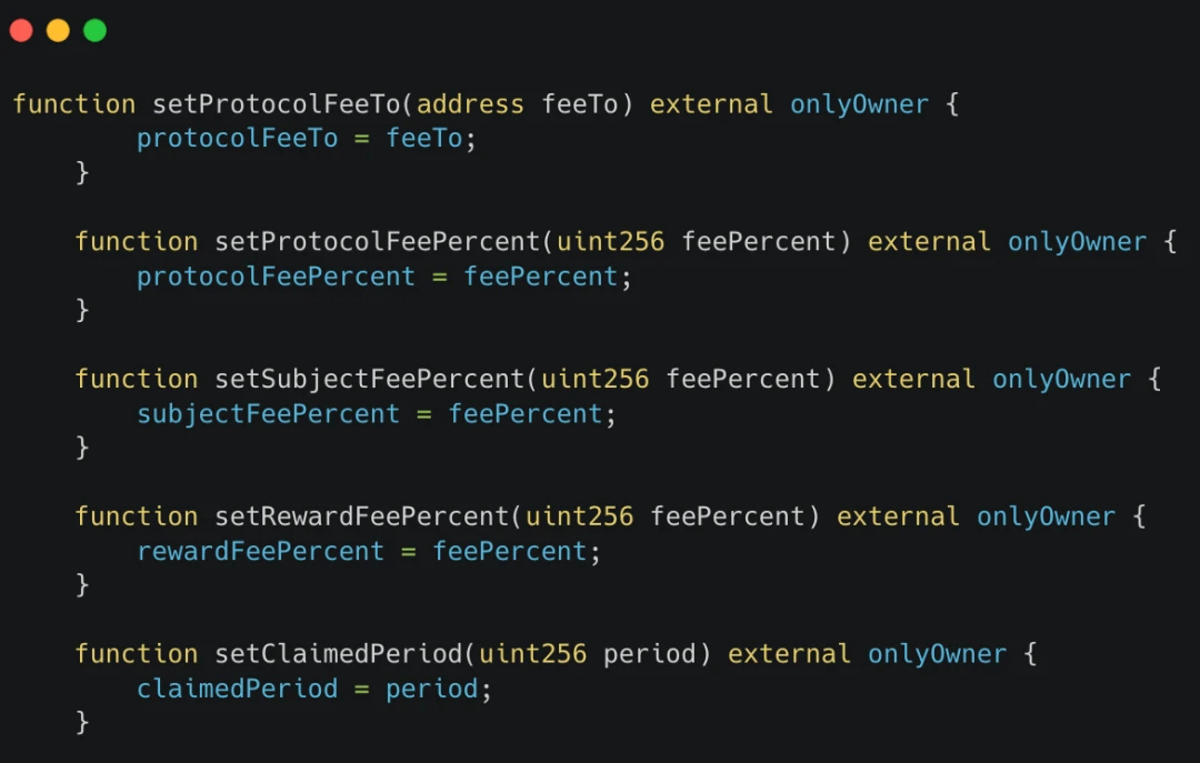 与 Friend.tech 风险类似,TOMO 的中心化风险不可忽视。合约的 owner 可以无限制的调整手续费率,从而收取高昂的手续费,甚至可以设置 100% 的手续费让用户收不到卖出的钱,也可以设置超过 100% 的手续费率来暂停买入卖出功能。