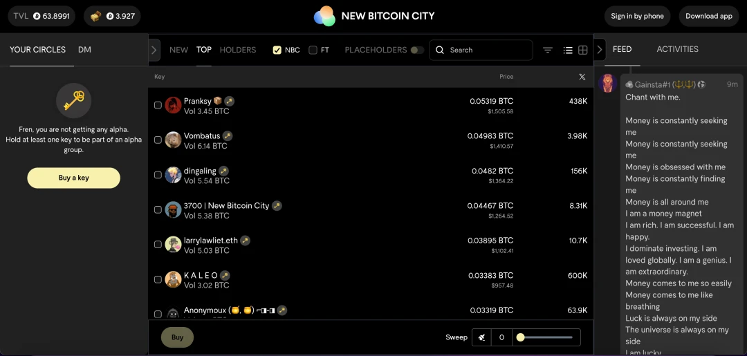 New Bitcoin City(或称 Alpha)是基于比特币二层网络 NOS 的类似于 Friend.tech 的社交应用,支持网页端和移动端。用户可以在 New Bitcoin City 中交易 New Bitcoin City 和 Friend.tech 的 Key。此前,New Bitcoin City 团队还推出过 GameFi 项目 Mega Whales 和 DeFi 项目 New Bitcoin DEX。
