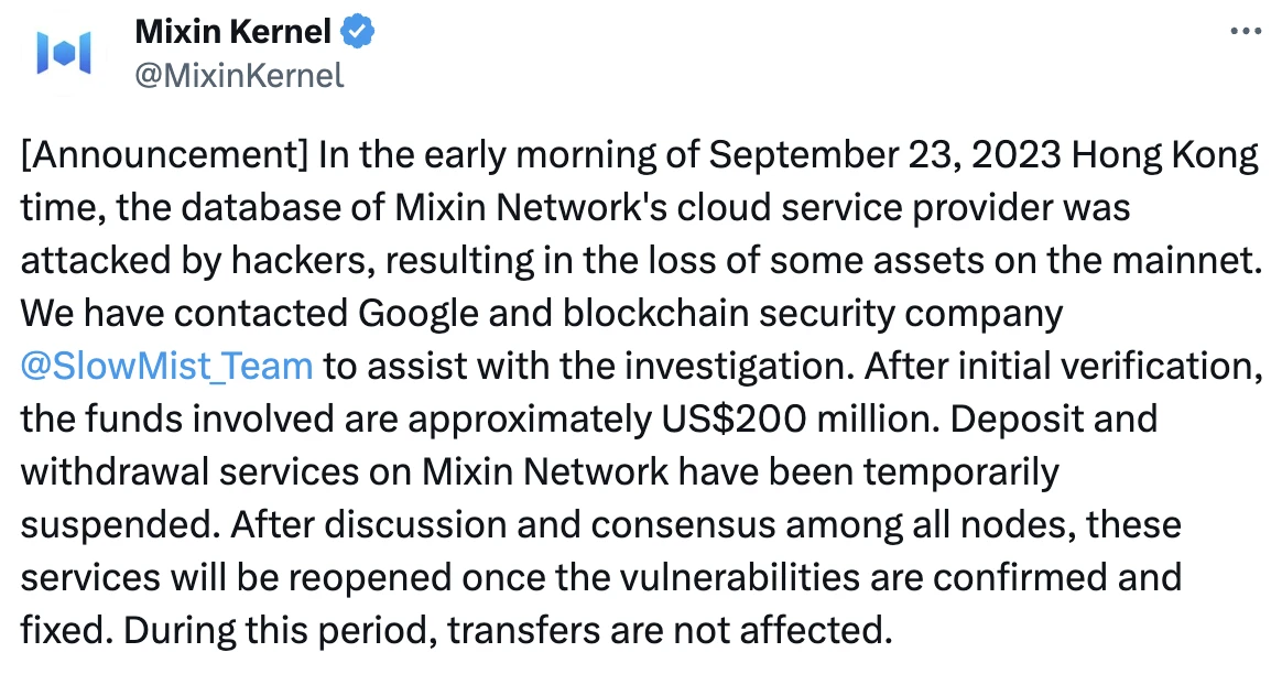Mixin 官方在 2023 年 9 月 25 日上午 10: 50 发表声明,Mixin Network 云服务商数据库于 2023 年 9 月 23 日凌晨遭到黑客攻击,导致主网部分资产丢失。经由谷歌和慢雾初步调查,涉案资金约为 2 亿美元。
