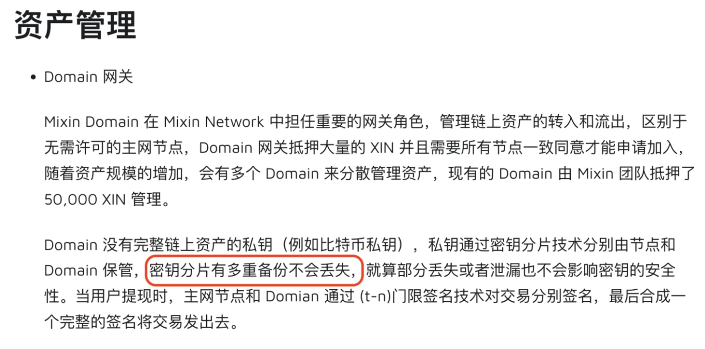 b)密钥分片保存在【Mixin Domain】和【Mixin 全节点】上,且 Mixin 官方白皮书明确表示有对分片进行备份,客观上存在内部 & 外部窃取分片进行多签交易的风险。(此处,也是云服务器数据被盗后导致用户 BTC 丢失的最大概率原因)