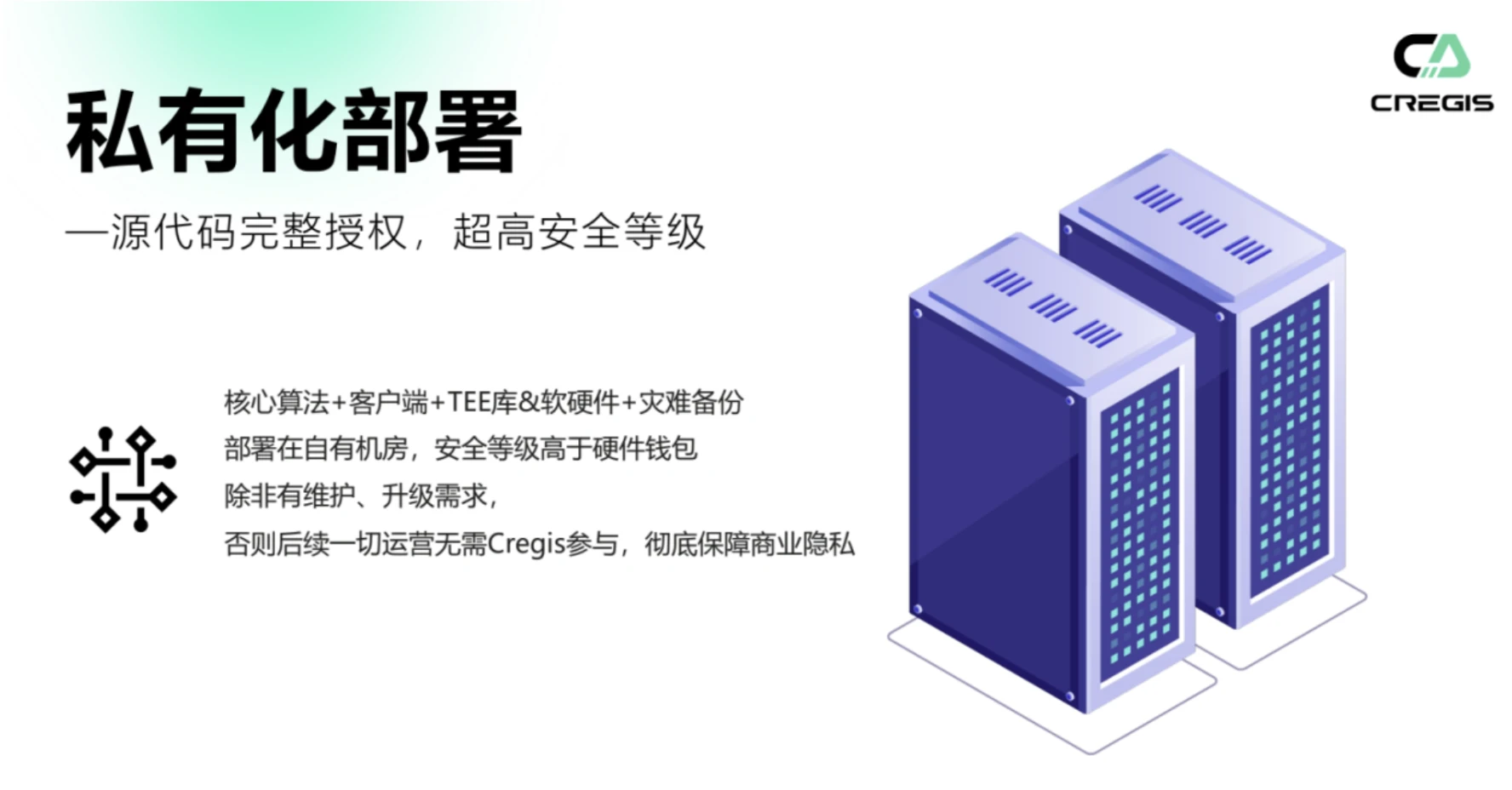 Cregis 的私有化部署在安全性方面将所有数据和交易活动限制在项目方机构私有服务器内,以确保了用户资产和数据的安全可控。这样的安全模型能有效阻隔各种外部威胁,包括但不限于黑客攻击、数据窃取或第三方服务的不稳定性。即使是 Cregis 也不能直接接触到用户的私钥分片。