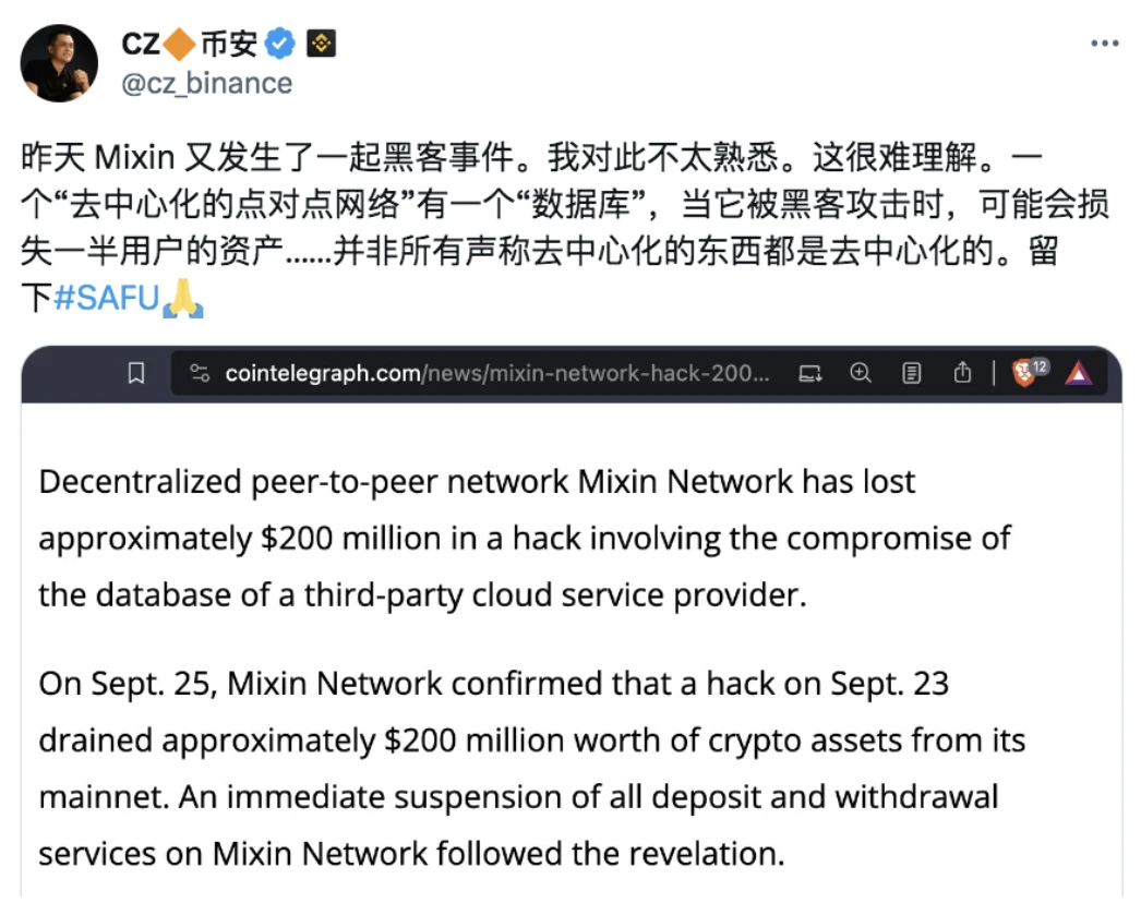 (CZ 在 X 上质疑 Mixin 的去中心化程度)