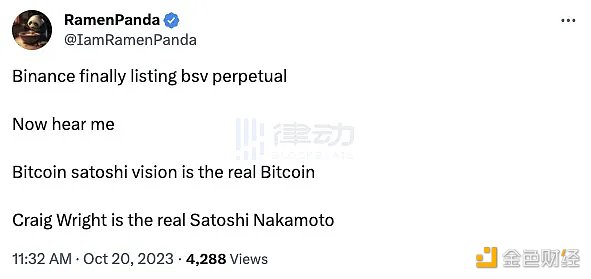 有人发表评论称「BSV 是真正的比特币,而 CSW 无疑是真正的中本聪」。虽然这样的观点更多是作为打趣或讽刺的「梗」,如今的币圈叙事已大不同,而 CZ 也不再热衷于表达态度。