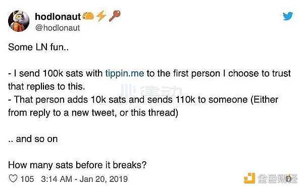 在 Craig Wright 声称自己是中本聪的同时,当时的加密圈正传播着「比特币闪电火炬传递」的实验,通过闪电网络发送 100000 聪(最小的比特币单位,等于 0.001 个比特币)的比特币交易。然后,此交易的接收方将增加 10000 聪并将其发送给下一个参与者,依此类推。如果火炬在失败之前包含的金额比去年更大,那么表明网络已经成长了。
