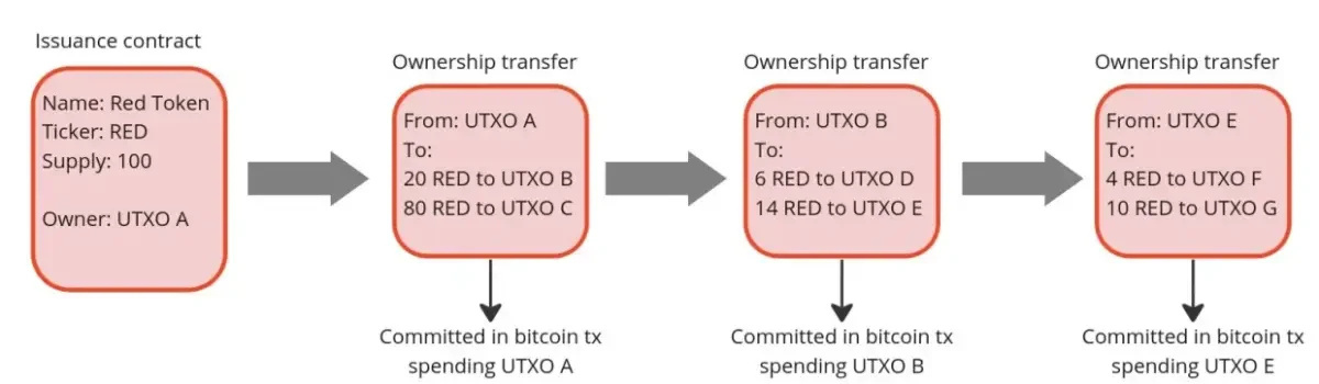 RGB 的设计目的是在 UTXO 区块链(如比特币)上运行可扩展、稳健和私密的智能合约,允许数字资产和智能合约为比特币带来更多功能。通过 RGB,开发者可以执行如代币发行、NFT 铸造、DeFi、DAO,以及更多复杂的多类别智能合约,从而实现在比特币强大的区块链之上不断刺激创新的同时,保持其安全性。具体执行流程: