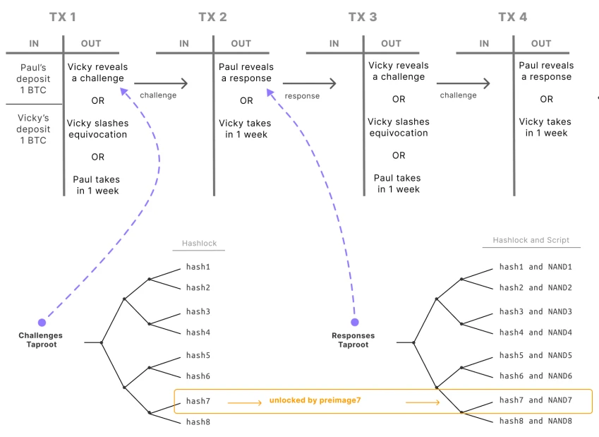 2. 链下计算: BitVM 的独创性在于它对计算工作负载的处理。与将大量计算负担放在链上的传统区块链操作不同,BitVM 的大部分复杂计算在链下执行的。链下计算提供了更高的速度和灵活性,减少了直接存储在链上的数据量。