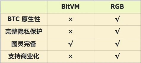 • BTC 原生性: BitVM 需要对比特币进行协议更改,而 RGB 可以用软分叉实现