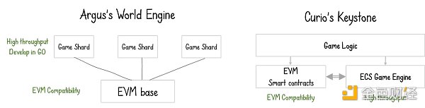 这种方法的例子是 Argus 的 World Engine 和 Curio 的 Keystone。World Engine 将游戏逻辑的执行分离到一个单独的层,称为 Game Shard,它在 EVM 兼容层之上运行。Game Shard 还设计为允许水平扩展,以根据需求调整总 Rollup 吞吐量。类似地,Curio 的 Keystone 架构将高吞吐量游戏引擎与 EVM 捆绑在一起作为 Rollup 执行环境。这里的挑战是实现 EVM 引擎和游戏引擎之间的无缝互操作性。