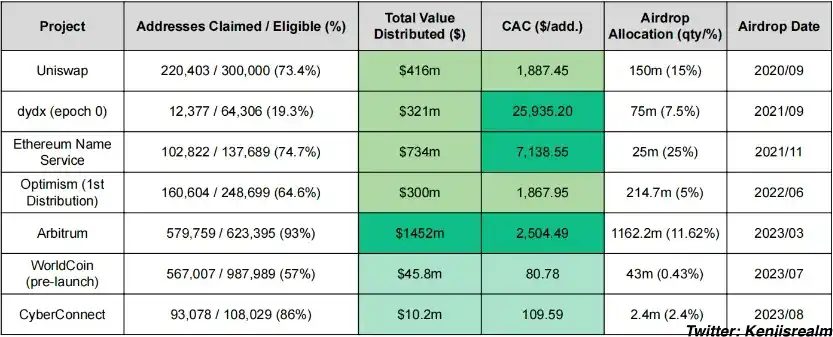 这是一个好的开始,尽管我确实想指出这些 CAC(从项目的角度来看)都是被低估的数字,因为它们只是:美元价值 ($) / 声称的地址。这个计算没有考虑实际保留空投的百分比。鉴于通常只有 10% -20% 的地址持有空投,可以安全地假设这些 CAC 数字比您在上面看到的高 5 倍到 10 倍。