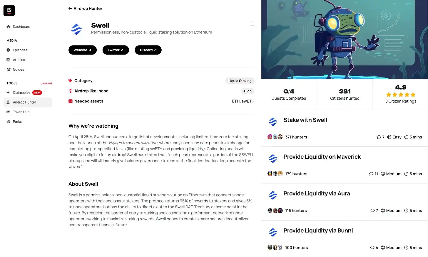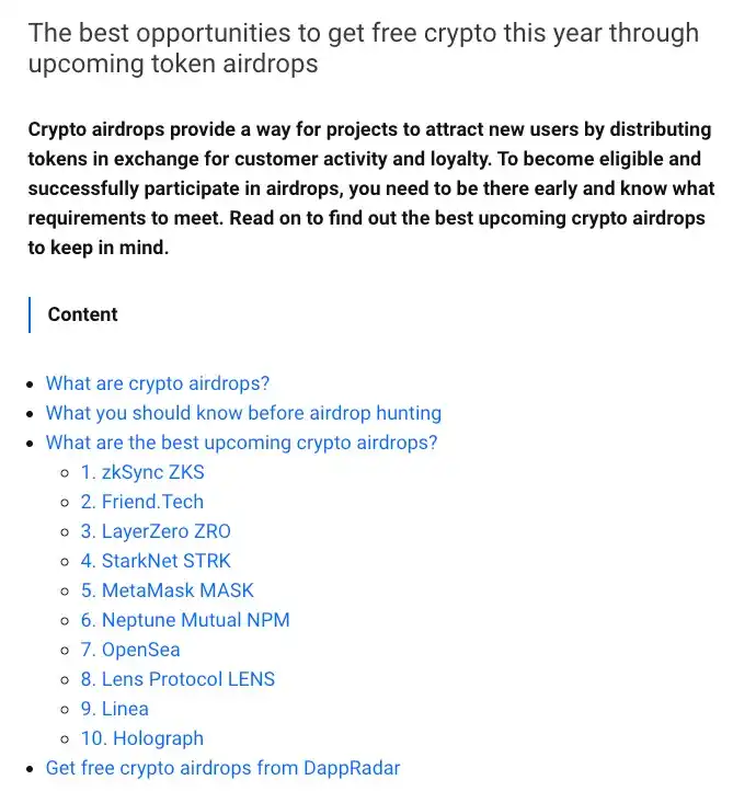 幸运的是,对于你这个空投猎人,已经有一个专门为你搭建的寻找空投的整个产业。通常,这些空投发现网站要求你执行一些非常明确的「操作」,并且需要在链上有证据证明你已经执行了这些操作。不管是你的奶奶还是你的机器人执行的操作,只要确保链上能看到这笔交易即可。
