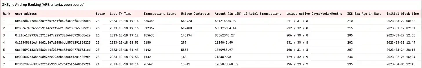 令人着迷的是所绘制的详细程度。查看此表中使用映射出来的所有列。任意分数、上次交易时间、交易计数、唯一合约、总交易美元金额、唯一活跃天/周/月、钱包年龄和区块时间。