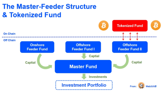 私募基金通过主联架构(Master-Feeder Structure ),直接将上一层联接基金(Feeder Fund)代币化来实现整个私募基金部分基金份额的代币化。在主联架构中,基金管理人可从不同类型的投资人手中募集资金创立 Feeder Fund,而 Feeder Fund 把该等资金投资于一个主基金(Master Fund)。投资人在 Feeder Fund 层面进行投资并支付管理费,而交易和投资则在 Master Fund 层面进行。