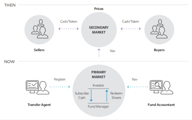 传统基金的运行流程本质上是低效的:(1)基金份额为满足认购而设立,为满足赎回而注销;(2)基金定价不是根据买入和卖出,而是根据基金会计师设定的资产净值;(3)过户代理在资产净值的基础上通过接收、整合订单进行定价,并在集中登记册中通过入账方式结算订单,然后将订单与投资者和基金的现金头寸进行核对;(4)在基金份额和现金结算释放前的三天,基金和投资者将面临市场波动和交易对手风险;(5)基金的流动也迫使基金管理人保留资金头寸,以承担重新平衡基金净值的成本。