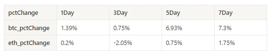 过去一周 BTC 价格上升 7.3% %,ETH 价格上升 1.75% 。