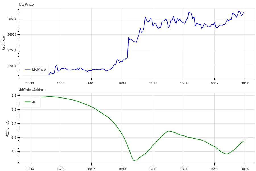 上图蓝色先为比特币价格,绿色线为[‘btc’, ‘eth’, ‘bnb’, ‘ltc’, ‘bch’, ‘doge’, ‘matic’, ‘sol’,’link’,’uni’, ‘enj’,’gala’, ‘mana’, ‘axs’, ‘dydx’, ‘fet’ ,’gmx’, ‘xlm’, ‘xrp’, ‘ada’, ‘trx’, ‘sol’, ‘dot’, ‘avax’, ‘shib’, ‘atom’, ‘xmr’, ‘etc’, ‘ldo’, ‘hbar’, ‘apt’, ‘vet’, ‘qnt’, ‘vet’,’crv’, ‘aave’, ‘algo’, ‘ftm’, ‘ape’, ‘neo’, ‘sand’, ‘eos’, ‘xtz’, ‘rndr’, ‘theta’, ‘mkr’]整体的相关性