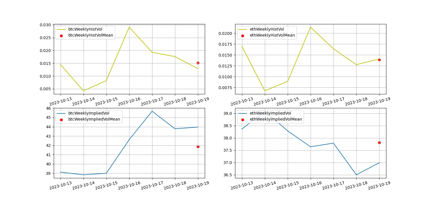 过去一周 BTC 历史波动率在 10.16 最高,隐含波动率上升;ETH 历史波动率在 10.16 最高,隐含波动率下降。