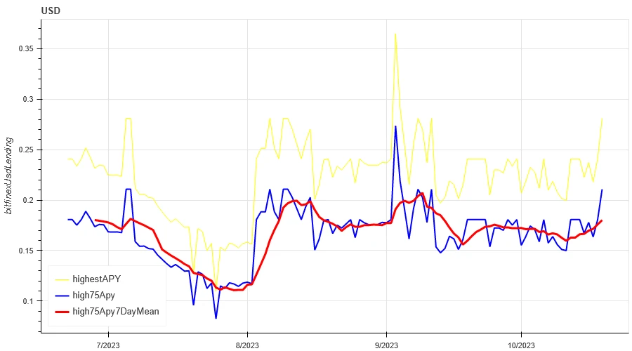 黄色线为 USD 利率的最高价,蓝色线为最高价的 75% ,红色线为最高价的 75% 的 7 天平均值