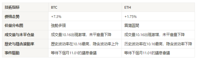 过去一周 BTC 与 ETH 在 10.16 交易量激增;未平仓量从高位下降。