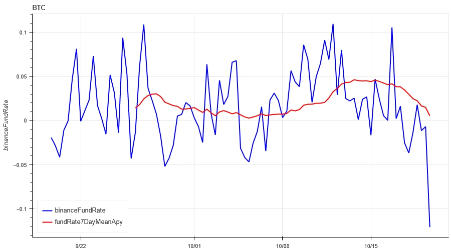 蓝色线为币安上 BTC 的资金费率,红色线为其 7 日平均