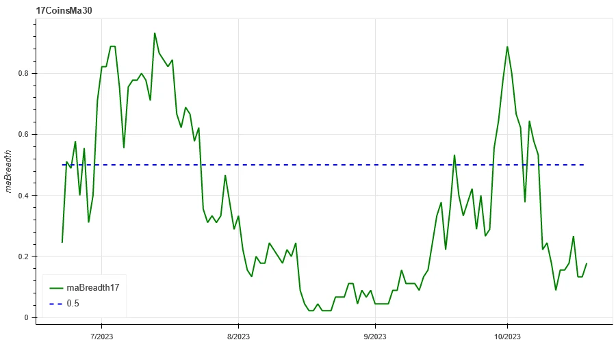 上图为[‘btc’, ‘eth’, ‘bnb’, ‘ltc’, ‘bch’, ‘doge’, ‘matic’, ‘sol’,’link’,’uni’, ‘enj’,’gala’, ‘mana’, ‘axs’, ‘dydx’, ‘fet’ ,’gmx’, ‘xlm’, ‘xrp’, ‘ada’, ‘trx’, ‘sol’, ‘dot’, ‘avax’, ‘shib’, ‘atom’, ‘xmr’, ‘etc’, ‘ldo’, ‘hbar’, ‘apt’, ‘vet’, ‘qnt’, ‘vet’,’crv’, ‘aave’, ‘algo’, ‘ftm’, ‘ape’, ‘neo’, ‘sand’, ‘eos’, ‘xtz’, ‘rndr’, ‘theta’, ‘mkr’]在 30 日均线上方的占比