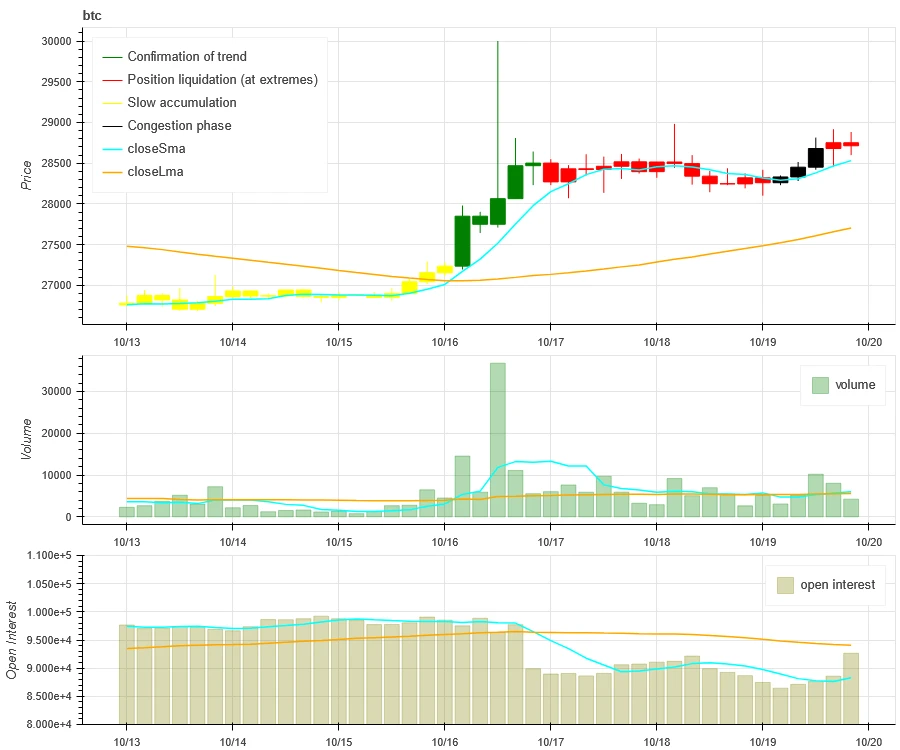 上图最上方 BTC 的价格走势,中间是成交量、最下方是未平仓量、浅蓝色是 1 天均值,橘色是 7 天均值。其中 K 线的颜色代表当前的状态,绿色是价格上升有成交量支持,红色是在平仓,黄色是在缓慢累积仓位,黑色是拥挤状态。