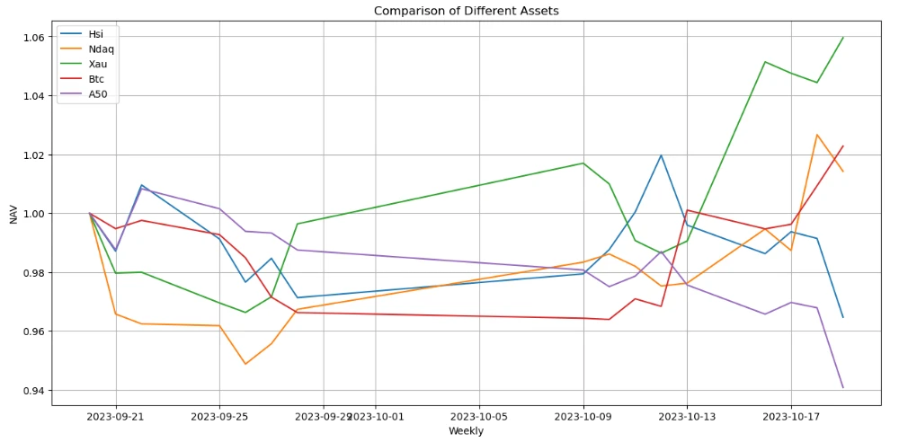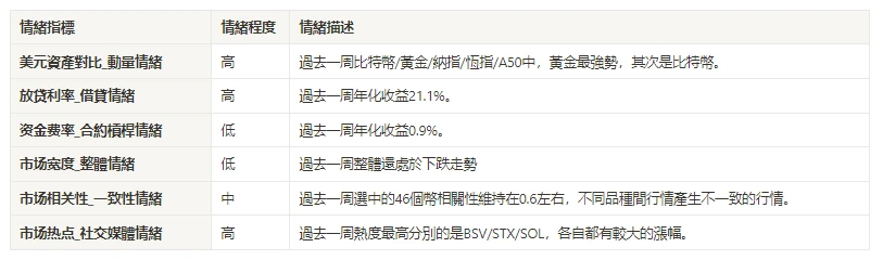 过去一周比特币/黄金/纳指/恒指/A 50 中,黄金最强势,其次是比特币,而表现最差的为 A 50 。
