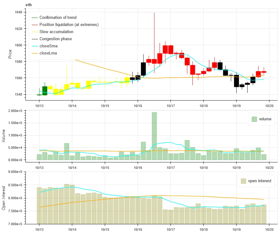 上图最上方 ETH 的价格走势,中间是成交量、最下方是未平仓量、浅蓝色是 1 天均值,橘色是 7 天均值。其中 K 线的颜色代表当前的状态,绿色是价格上升有成交量支持,红色是在平仓,黄色是在缓慢累积仓位,黑色是拥挤状态。