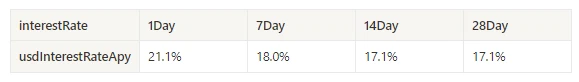 过去一周 USD 放贷年化收益平均为 21.1% ,短期利率上升。