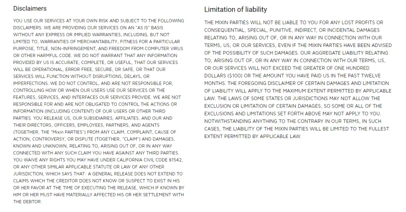 按照普通人的朴素法感情,我把钱存到一个平台,因为平台的保管不善丢失,当然是平台承担全部的赔偿责任。但是在互联网服务中很多平台方具有绝对的主导权,比如Web2世界中你的微信、抖音等账号的所有权都是在平台手里,用户所拥有的只是对软件的使用权。Web3试图打造一个去中心化、用户完全拥有自己收据的世界,但是在Web3开疆拓土的前期仍然少不了中心化的机构参与,比如各大交易所、比如 Mixin 平台。而中心化机构必然是先以自己的利益为优先,Mixin 也不例外,在其用户注册的《服务协议》里,“免责声明”条款中明确约定 Mixin 平台:
