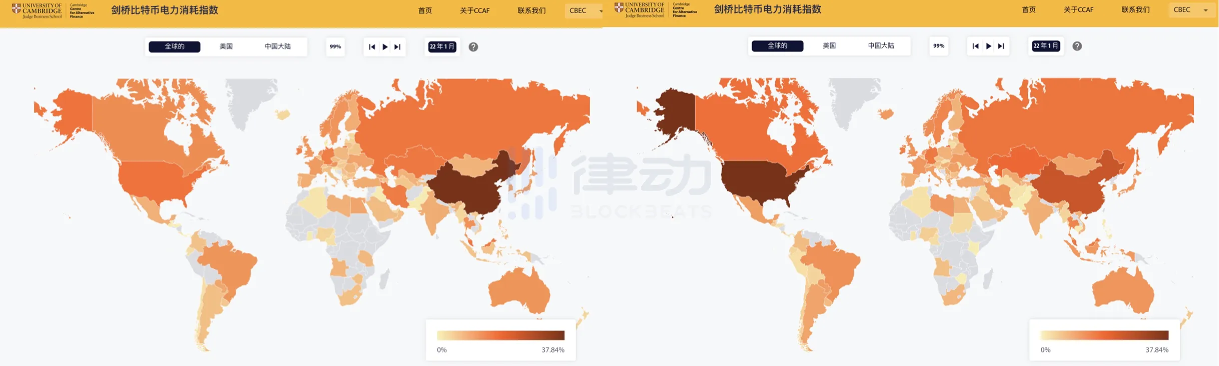 左图:2021 年 1 月;右图:2021 年 12 月。图源: 剑桥比特币电力消耗指数