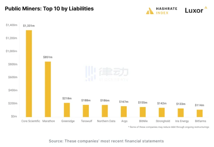 根据 Hashrate Index 的 一份报告 显示,主流中心化矿企到 2022 年底的集体债务总额超 40 亿美元,其中 Core Scientific 债务最多,截至 2022 年 9 月 30 日欠债权人 13 亿美元;Marathon Digital 欠债约 8.51 亿美元,但大部分是可转换票据;第三债务人是 Greenidge Generation,欠债 2.18 亿美元。